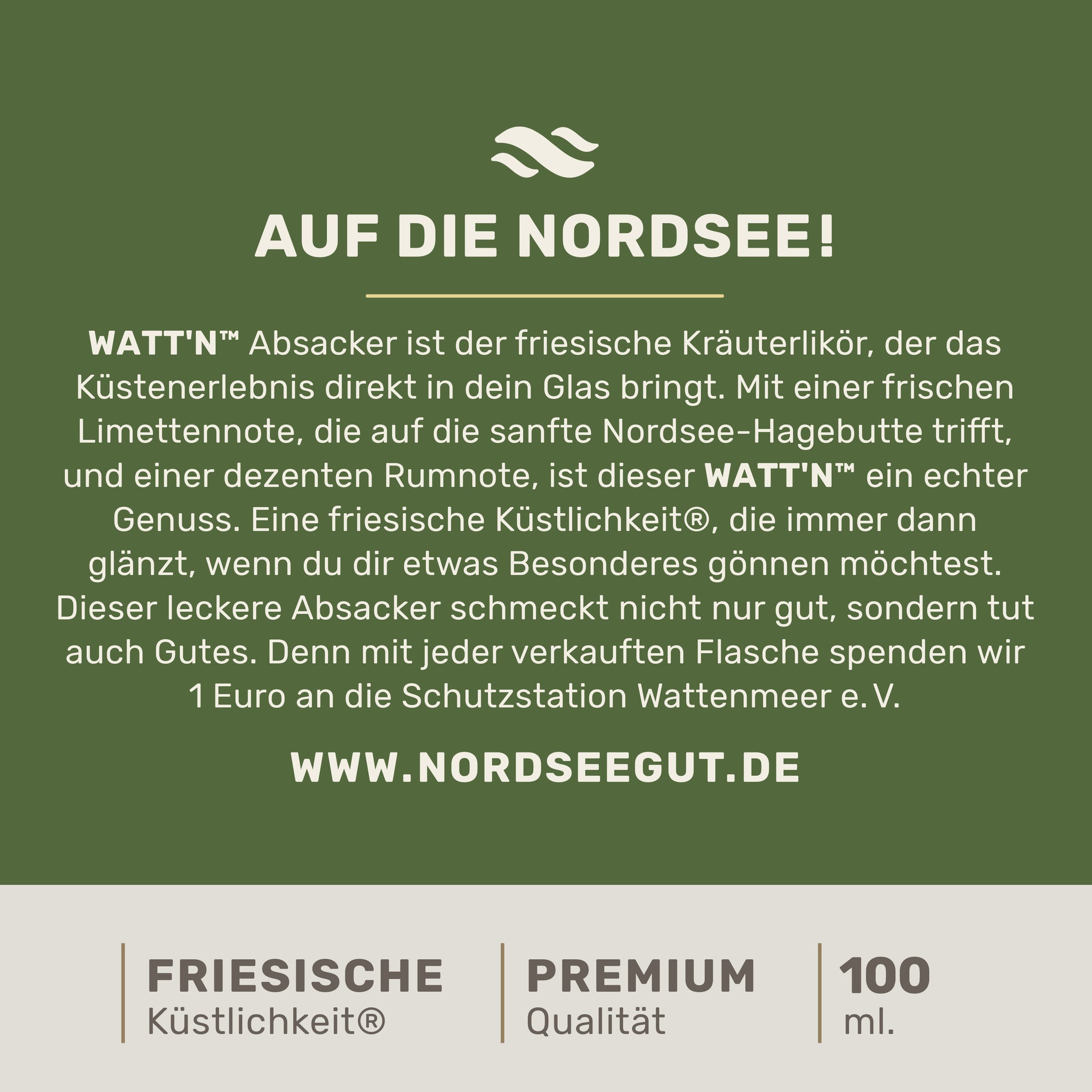 Die 0,1-l-Flasche WATT`N Absacker ist dein kleiner Nordsee-Moment für unterwegs. Der friesische Kräuterlikör kombiniert eine frische Limettennote mit der sanften Nordsee-Hagebutte und einer feinen Rumnote. So entsteht ein runder, aromatischer Geschmack, der sowohl eisgekühlt als Shot als auch ungekühlt ein Genuss ist.