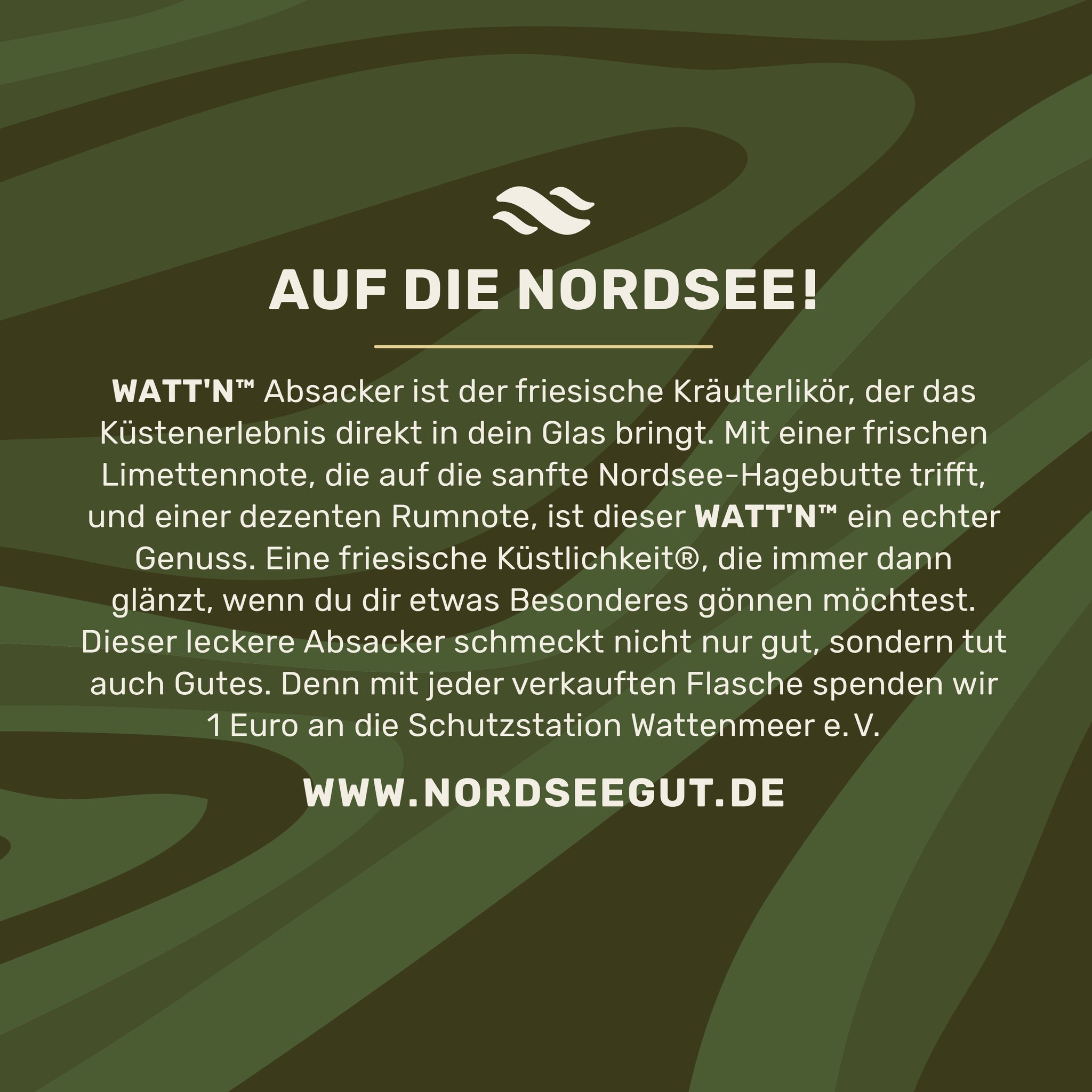 Die handliche Größe eignet sich perfekt als Mitbringsel, für Geschenksets oder um den Absacker einfach einmal auszuprobieren. Wie alle WATT`N Absacker-Produkte wird auch diese Variante in Schleswig-Holstein in Premium-Qualität hergestellt – und mit jeder verkauften Flasche fließt 1 € an die Schutzstation Wattenmeer e. V.